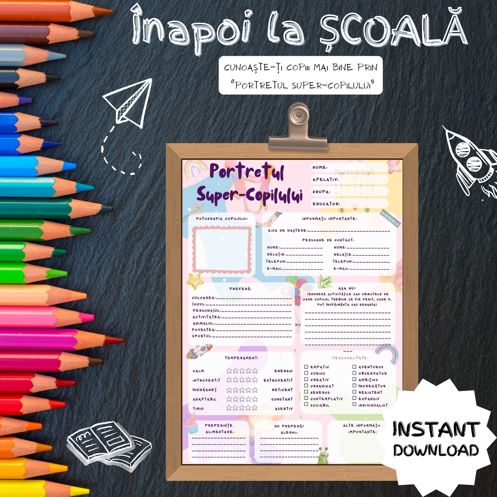 Această pagină distractivă și bogată în informații valoroase le oferă educatorilor și profesorilor unelte simple pentru a cunoaște fiecare copil în profunzime – totul într-un format printabil ușor de folosit.